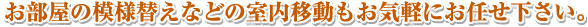 お部屋の模様替えやレイアウト変更なので、ほんのちょっと移動したい場合などでも、お一人で移動させるのはとても無理。そんなときは当社のスタッフにお任せ下さい。リビングから子供部屋への移動などの別室への移動、1階から2階への移動なども承ります。向きを変更したり、ほんの少し移動させただけで、ピアノが生き生きと輝き、音楽をますます楽しむことができるようになるかも知れませんよ。 |